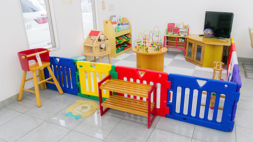 Honda Cars 兵庫中央 車検センターには、チャイルドコーナーもございます。お子様連れでも安心して車検を受けていただけます。更にお子様には安全運転免許証やお菓子のプレゼントもご用意しております。ペット同伴のお客様には、ペット用ゲージとワンちゃんのおやつをご用意しております。